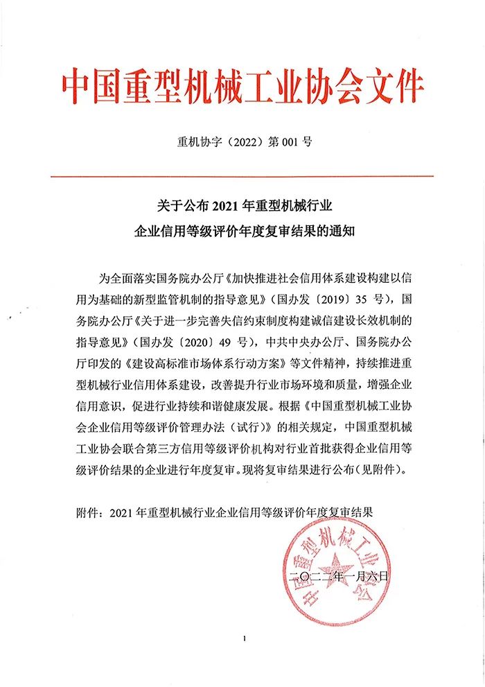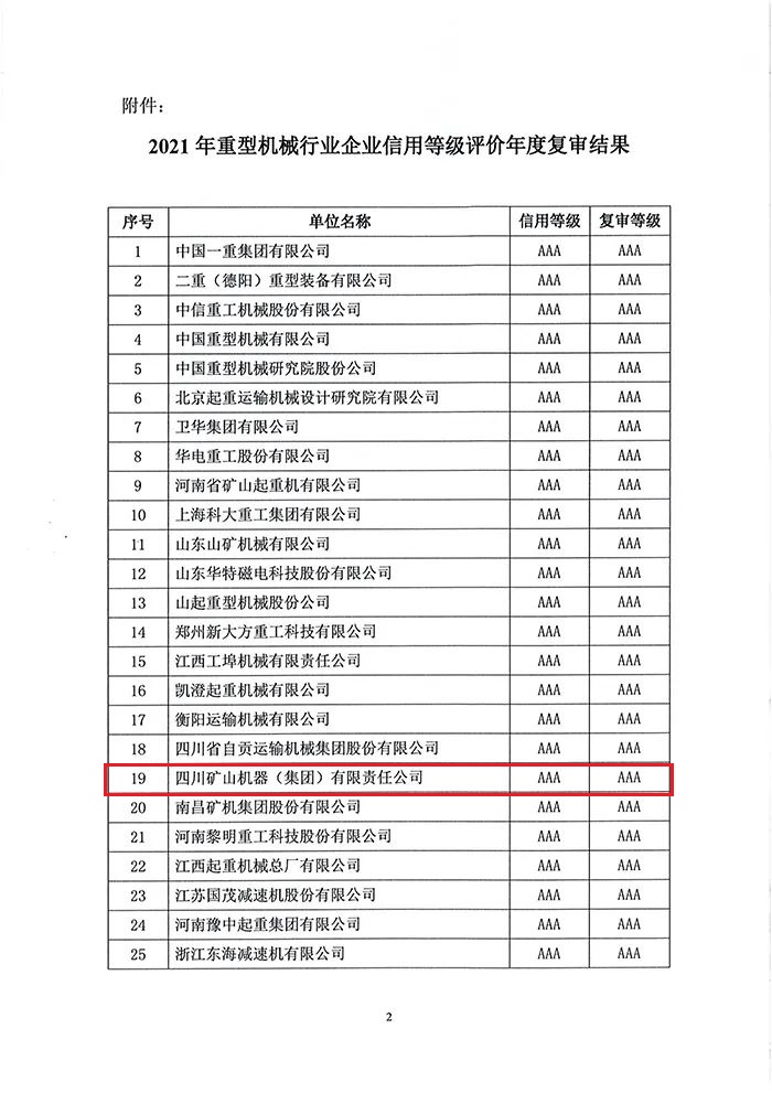 川礦集團(tuán)再獲重型機(jī)械行業(yè)AAA信用等級(jí)